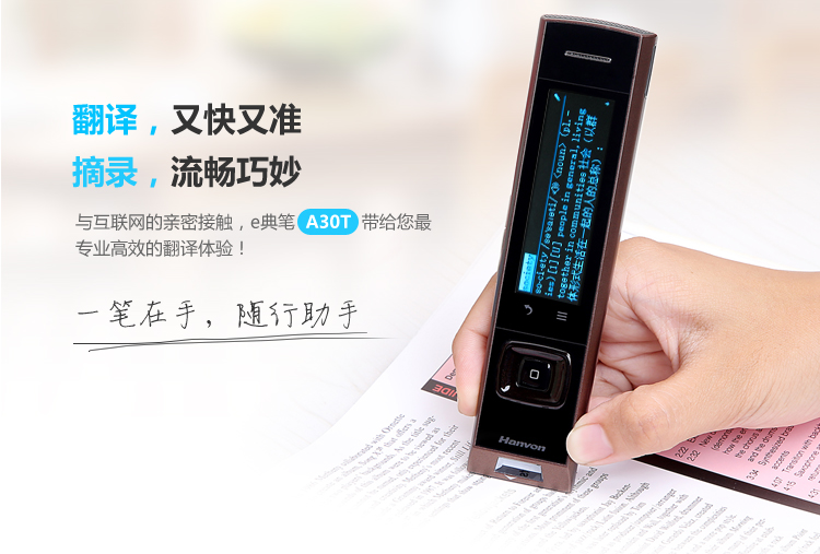汉王e典笔A30T是汉王最新多功能扫描翻译笔,生词长句,一扫即译。支持整句扫描,翻译结果立即呈现。内置牛津高阶英汉双解词典(第8版)、柯林斯、新时代日汉辞典、汉日词典、成语词典、新华字典等多部权威词典。拥有资料摘录、手机同步、高保真录音、云存储等功能。其采用的超宽触屏设计,可显示更多词条内容,带来更佳的触控体验。同时可收听单词真人发音,从此英文阅读,更加轻松自如。