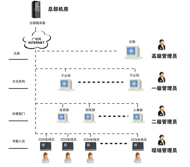 系统采用C/S架构,通过广域网实现了对连锁企业员工日常考勤的统一管理。管理人员可以随时随地使用电脑了解任一分支机构员工上岗情况,查看考勤记录的详细信息,提高了对连锁分支机构员工的管理水平。该系统满足上万台设备同时在线,以及10万人的实时考勤上传、查询需求。该系统即可满足国有大中型企事业单位的考勤管理,也可满足中小型连锁企业的考勤管理需求。