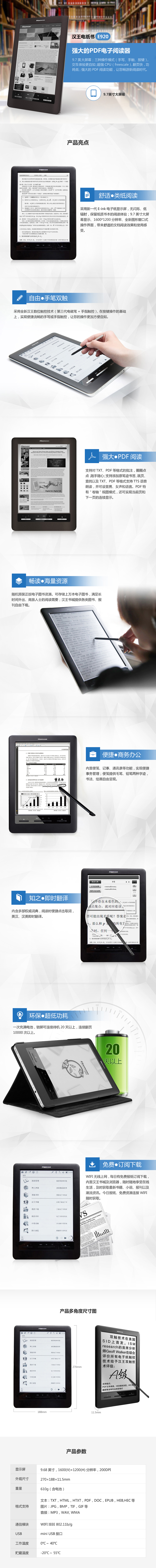 舒适阅读 基于电子墨水技术的电子纸显示屏,无闪烁、无辐射,保留纸质书本的阅读体验,适宜各种人群;9.68英寸大屏幕显示,全新图形窗口式操作界面,带来优良的文档阅读效果和使用感受。 超低功耗 一次充满电池,锁屏可连续待机20天以上,连续翻页10000次以上。 汉王双触 全新汉王数位触控技术(第三代电磁笔+手指触控),在按键操作的基础上,实现便捷流畅的手写和手指触控。 网络服务 WIFI无线上网,每日有免费报纸订阅下载,内置汉王书城及浏览器,随时随地享受在线生活,及时获取最新书籍、小说、报刊以及潮流资讯。 辅助阅读 支持对TXT、PDF等格式的批注,圈圈点点,随手随心;支持添加书签;支持跳页、查找;TXT、PDF等格式支持TTS语音朗读,并可设置男、女声和语言:PDF特有“卷轴”视图模式,实现当前页和下一页的连续显示;多种格式的文本、图片可支持自动翻页、手指点击和滑动翻页。 中英词典 内含权威词典,阅读时便捷点击取词,英汉、汉英即时翻译。 商务办公 便笺、记事、通讯录等,实现便捷事务管理;便笺提供毛笔、铅笔两种字迹,书法、绘画自由呈现。 音频控制 内置高保真音频编解码电路,支持多种播放模式,阅读同时享受优美音乐;便捷设置录音快捷键,随点随录。 附加功能 统象棋、五子棋、数独等游戏,工作之余方便休闲娱乐。 海量资源 随机预装正版电子图书资源。可存储上万本电子图书,满足长时间外出、商旅人士的阅读需要;汉王书城提供各类图书、报刊自由下载;支持USB主口,可外接U盘,资源即插即用。 汉王书城提供丰富图书、报刊资源。超过10万册的正版图书,多种报纸、杂志便捷下载。欢迎随时访问汉王书城 http://www.hwebook.cn |